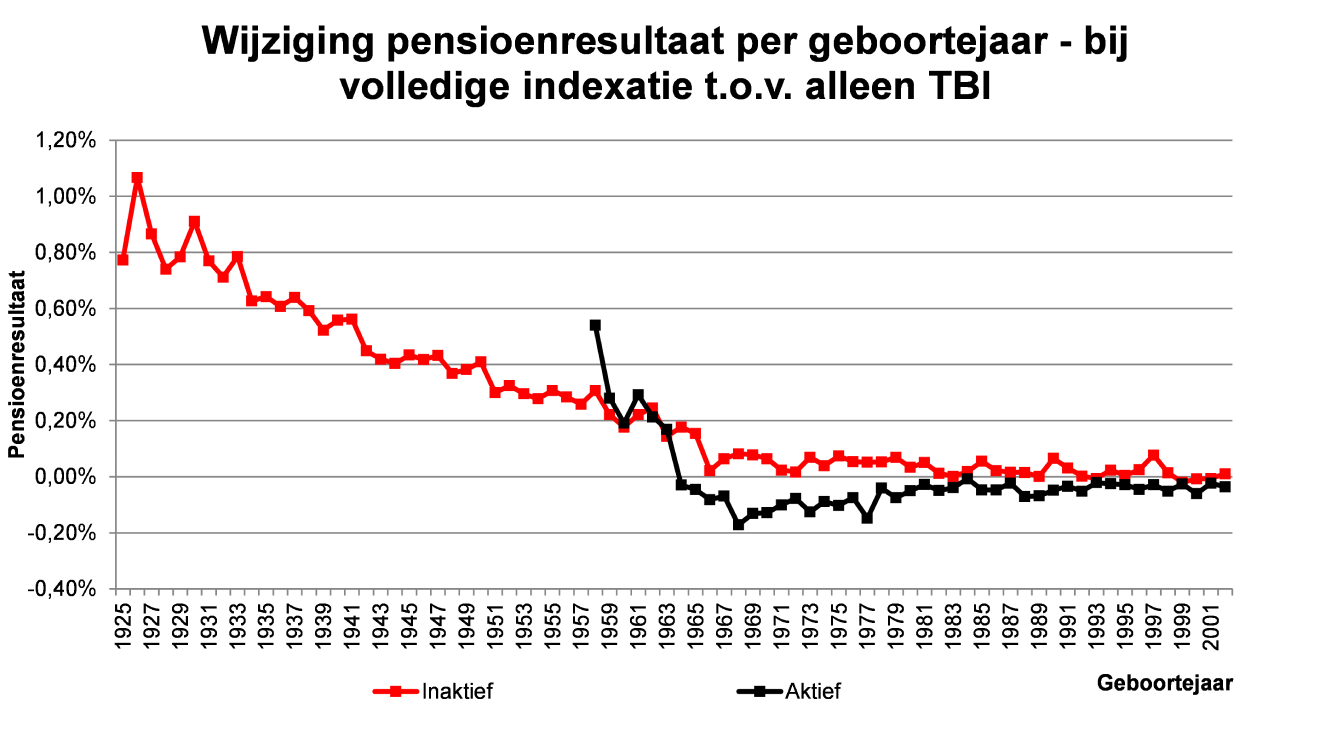 In de grafiek kan je aflezen dat bijvoorbeeld voor iemand geboren in 1943 alle toekomstige pensioenuitkeringen opgeteld (naar verwachting) samen 0,4% hoger zijn mét deze aanpassing, dan alle toekomstige pensioenuitkeringen als we niet zouden besluiten tot deze extra verhoging. Voor een actieve deelnemer geboren in bijvoorbeeld 1975 is dat 0,1% lager.